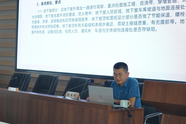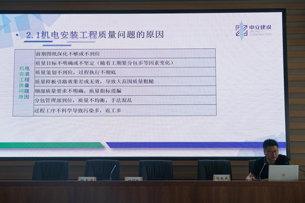 此次研討會由葉麗紅主持,技術(shù)部經(jīng)理賴軍偉通過PPT展示了主體結(jié)構(gòu)關(guān)注部位及核查依據(jù),并對防水工程、混凝土工程、砌體及二次結(jié)構(gòu)、屋面工程中常見質(zhì)量通病進行講述。安裝總工馮良武分享了機電安裝工程的通病問題以及創(chuàng)優(yōu)策劃與實施。