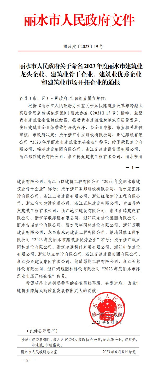 浙江中立建設有限公司、正達建設有限公司被授予“2023年度麗水市建筑業(yè)龍頭企業(yè)”稱號。