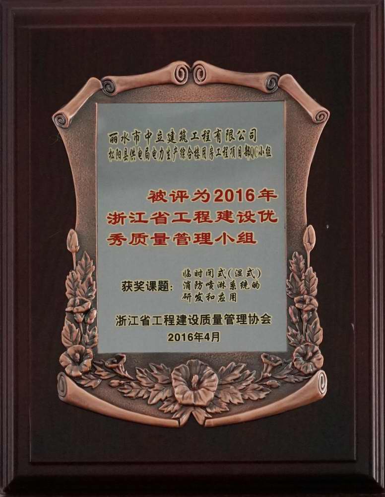 浙江省工程建設(shè)質(zhì)量管理協(xié)會(huì)于2016年4月27日至29日在杭州之江飯店舉行2016年度浙江省工程建設(shè)優(yōu)秀QC成果發(fā)布會(huì)。我公司松陽(yáng)縣供電局電力生產(chǎn)綜合樓用房工程項(xiàng)目部QC小組的活動(dòng)成果“臨時(shí)閉式(濕式)消防噴淋系統(tǒng)的研發(fā)和應(yīng)用”參與交流,小組被評(píng)為2016年浙江省工程建設(shè)優(yōu)秀質(zhì)量管理小組。該成果有效地解決了高層建筑施工階段火災(zāi)控制的安全保障問題,具有施工方便、安全可靠等優(yōu)點(diǎn),且該系統(tǒng)可周轉(zhuǎn)多次重復(fù)利用,節(jié)約了工程造價(jià)成本,值得推廣到其它高層建筑施工項(xiàng)目部。