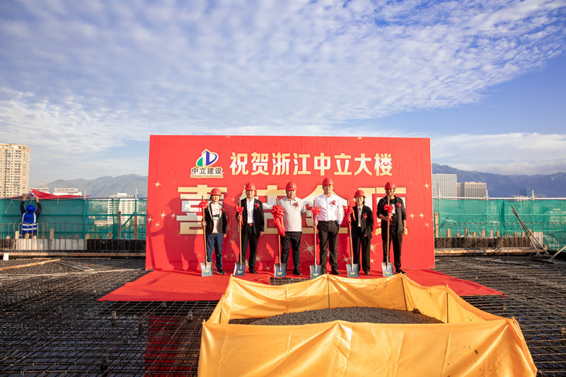 公司董事長周國強(qiáng)、副董事長周健、總經(jīng)理鐘鳴、副總經(jīng)理池甘萍、副總經(jīng)理葉麗紅等人共同拿起鐵鍬,為中立大樓澆筑結(jié)頂,迎來了歷史性的時(shí)刻。