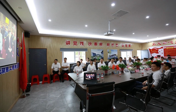 支部建在工地上!7月1日,公司黨支部書(shū)記鐘鳴、董事長(zhǎng)周健帶領(lǐng)全體黨員、高層人員來(lái)到麗水電大蓮都學(xué)院新建工程項(xiàng)目,首先和項(xiàng)目工作支部全體黨員觀看慶祝中國(guó)共產(chǎn)黨成立100周年大會(huì)直播實(shí)況。